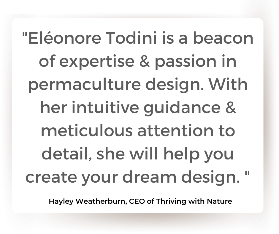 "Eléonore’s passion for permaculture really shows in her projects and heer client plans. She takes the time to get to know you as a person and helps fit your personality to form a vision together to make your dreams a reality. A pleasure to work with during every step of the way and her attention to detail is second to none"